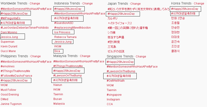 #Happy25thJessDay #시카야생일축하해 are trending in Indonesia, Malaysia, Japan, Korea, Philippines, Singapore and Worldwide!